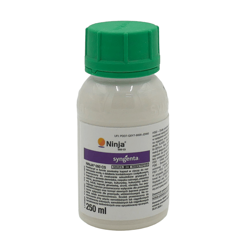 Ninja 050 CS to insektycyd o działaniu kontaktowym i żołądkowym, przeznaczony do zwalczania najważniejszych szkodników w uprawach rolniczych, warzywniczych oraz sadowniczych. Zawiera substancję aktywną lambda-cyhalotrynę, należącą do grupy syntetycznych pyretroidów, która działa na układ nerwowy owadów, powodując ich szybkie porażenie. Preparat wykazuje bardzo szybki efekt działania – śmierć szkodników następuje w ciągu kilku minut od kontaktu z rośliną. Ninja 050 CS skutecznie zwalcza mszyce, skrzydlaki, wciornastki, rolnice, gąsienice motyli, stonkę ziemniaczaną, słodyszka rzepakowego i inne groźne gatunki. Preparat można stosować zarówno profilaktycznie, jak i interwencyjnie, przy dużym nasileniu presji szkodników. Technologia mikroenkapsulacji (CS) zapewnia stopniowe uwalnianie substancji aktywnej, zwiększając trwałość efektu i odporność na zmywanie.