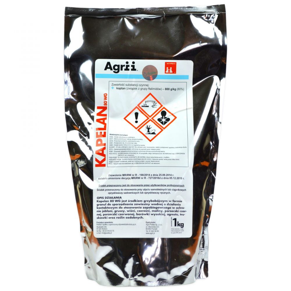 Kapelan 80 WG to fungicyd w formie granulatu do sporządzania zawiesiny wodnej (WG), przeznaczony do ochrony roślin przed chorobami grzybowymi. Zawiera substancję czynną kaptan, która działa kontaktowo, uniemożliwiając rozwój patogenów na powierzchni liści i owoców. Środek wykazuje silne działanie zapobiegawcze i jest przeznaczony głównie do stosowania w sadownictwie. Kapelan 80 WG charakteryzuje się dobrą przyczepnością do powierzchni roślin i odpornością na zmywanie.
