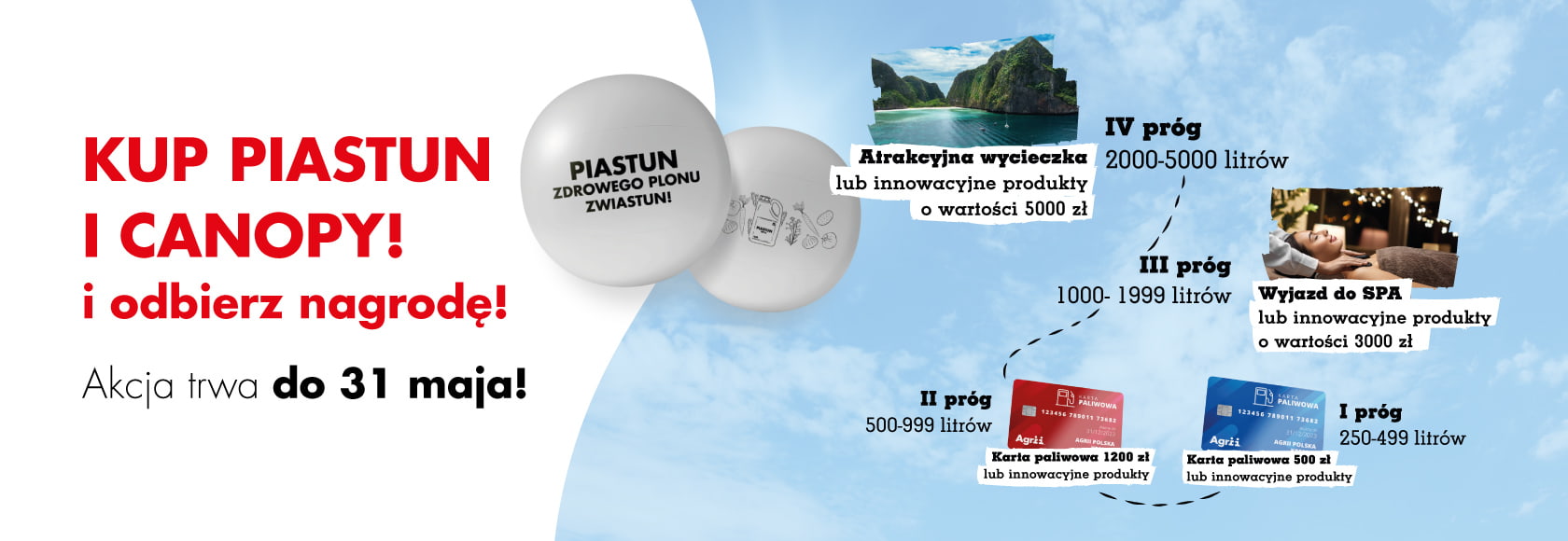 Wystarczy zakupić wskazane produkty (Piastun 250 S.C. lub Canopy) w Agrii Polska, w podanych niżej ilościach i cieszyć się wspaniałymi wartościowymi nagrodami: